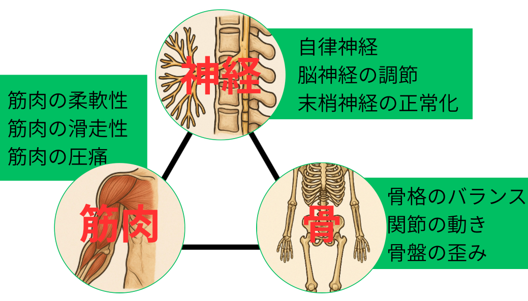 徒手による筋肉・関節・神経への検査を行い、根本的な原因を見極めた上で、 最適なアプローチをご提案します。 さらに、日常生活にもフォーカス。 習慣や生活背景を考えながら、痛みの緩和や再発予防につながる ストレッチやトレーニングも指導いたします。 このように、一人ひとりに合わせた多角的なアプローチで、 身体と心の健康をサポートします。